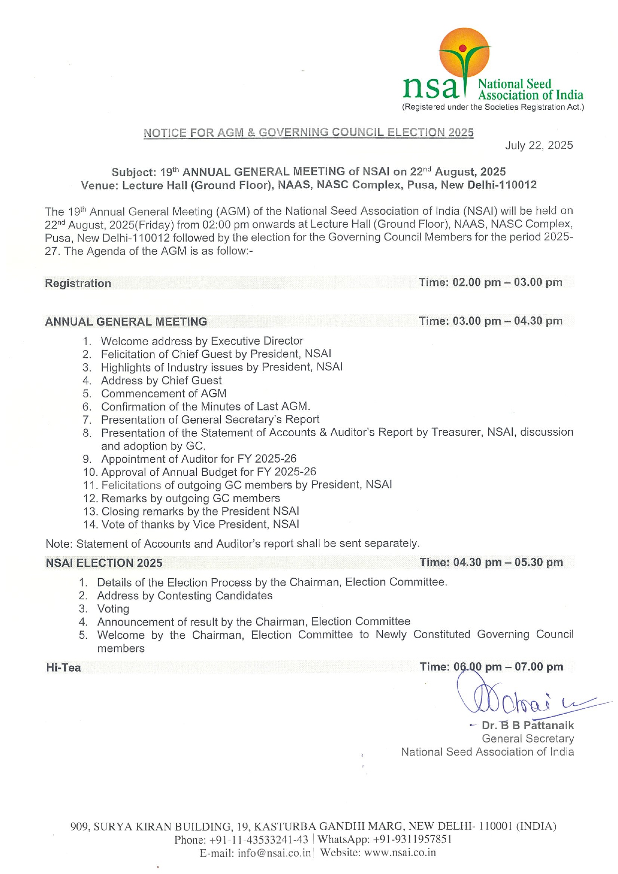 You are cordially invited to attend the 19th Annual General Meeting (AGM) of NSAI, scheduled for 22nd August 2025 at 2:00 PM at the Lecture Hall (Ground Floor), National Academy of Agricultural Sciences, NASC Complex, Pusa, New Delhi â 110012.